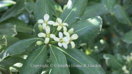 attractive evergreen shrub looks neat through all seasons making it very popular for foundation and mass planting. The creamy white blooms in the spring smell like orange blossoms. 'Variegata' has white-edged leaves.