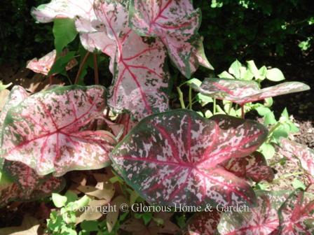 Caladium, angel wings, Zones 10-11. Big tropical-looking caladiums are fun to grow in containers or the shady border for splashes of color. One of the best summer plants for a shady location. Plant them after danger of frost is past and soil temperature has warmed up. As these tubers are not winter hardy above Zone 10, they must be dug and stored before frost. Dig up the tubers at the end of the season, remove the foliage and allow them to dry for a few days, then store in a cool dry location, but not lower than 55.° There are many great varieties with fascinating color combinations of white, pink, red and green. Some white varieties include ‘Candidum,’ ‘Moonlight,’ and ‘White Christmas.’ For pinks try ‘Apple Blossom,’ ‘Pink Splash,’ or ‘Spring Fling.’ If dramatic red is what you crave, look for ‘Brandywine,’ ‘Frieda Hemple,’ or ‘Red Flash.’ Some lovely ones that combine white with pink and green include ‘Carolyn Whorton,’ ‘Miss Muffet,’ and ‘Tapestry.’