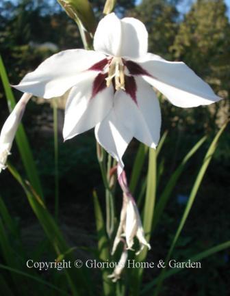 Eucomis comosa 'Sparkling Burgundy'Gladiolus callianthus ‘Murielae’, Abyssinian gladiolus or peacock orchid (formerly Acidanthera), Zones 7-10. This, to me, is one of the most elegant of the summer bulbs. Fragrant pure white flowers open wide to reveal a deep purple throat atop 2-3’ stalks in late summer. Corms should be planted in spring in full sun after frost danger is past. Above Zone 7, the corms should be dug in the fall and stored in 55° to 60° temperatures in perlite, vermiculite, dry peat moss, or even a paper bag. In Zone 7 and below, the corms can remain in the ground, but benefit from digging up every few years before frost when the foliage has yellowed, and replanting in the spring. Remove the old shriveled corm from the base of the new corm that has formed on top of it and separate the baby cormels that develop around the mother corm. These can be planted separately to develop for a couple of years until they reach flowering size.