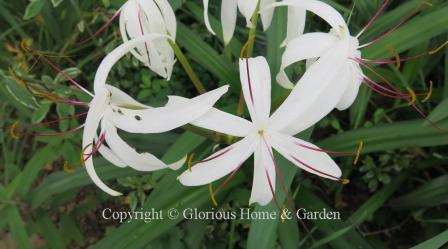 Crinum americanumCrinum hybrids, crinum lilies, Zones 7-10. Crinums are gorgeous summer bulbs that are a mainstay of the Southern summer border and never fail to draw attention—and most have a delicious fragrance. They love sun and require a lot of space as they grow into quite large, long-lived clumps. There are many hybrids available in white and lovely shades of pink and rose like ‘Elizabeth Traub,’ dark rose pink; ‘Ellen Bosanquet,’ deep rose; ‘Pink Mystery.’ pale pink; ‘Pink Perfume,’ pink buds open to pure white; C. x herbertii commonly called the “milk and wine” lily for its pink and white candy cane stripies; and C. x digweedii ‘Royal White,’ white with a narrow pale pink stripe down the center of each petal.