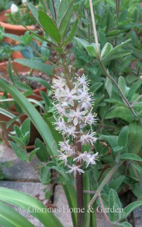 Eremurus himalaicusEucomis autumnalis, pineapple lily, Zones 7-10. Pineapple lilies are such fun! They look for all the world like pineapples with their tufts of leaves and individual white flowers arranged all around the stem. They do best in full sun, but mine have done pretty well in a semi-shady location. They may be called “autumnalis,” but mine bloom in mid-summer in 7b.
