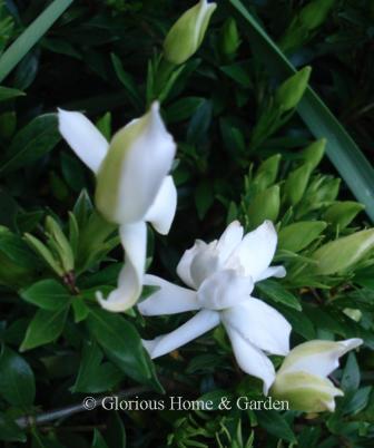 Fuchsia magellanicaGardenia jasminoides, cape jasmine or gardenia, Zones 7b-10. Late-spring to mid-summer, gardenias blossom in profusion all over the South, and they often have another flush of sweetly scented blooms in the fall. They are often used around patios and pools where their heady perfume sweetens the air. The buds unfurl into waxy white blooms set off by deep evergreen foliage. The drawbacks are the susceptibility to powdery mildew, white flies and other pests, and the fact that the yellowing spent blossoms can be somewhat messy, but the fragrance is worth it. There are several different forms that make gardenias useful for various situations. 'Radicans' is a low-growing spreading shrub with smaller leaves and smaller double flowers (heavy bloom in late May, early June with some repeat blooming in summer); 'Buttons' has small, single daisy-like flowers; and 'August Beauty' is the large double form that you typically associate with gardenias. It can reach 6' in height and repeats until October. ’Aimee’ (also known as First Love®). has large double, exquisite, rose-like blooms, though best for Zones 8-11. New more cold tolerant varieties are being developed and there are some interesting variegated ones as well—such as ‘Variegata.’