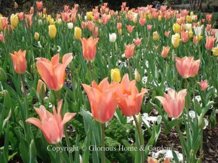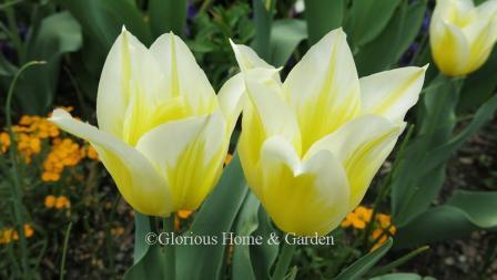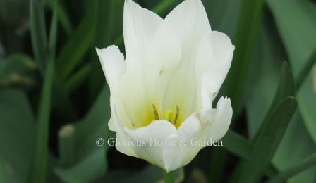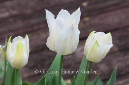 Tulips are one of my most eagerly anticipated arrivals in the spring garden. The glorious brilliant colors and forms shout spring and should not be missed. Tulips are easy to grow and lend themselves to beds, borders, containers, and window boxes. They can be dotted in a perennial border as accents, or densely planted in groups for swathes of color. The different types can be planted together for a succession of bloom to harmonize with other colors, or for a continuation of a specific color scheme. As an example, a lovely succession of white tulips could be ‘White Marvel,’ a Single Early for starters, continuing with ‘Mondial,’ a Double Early, then ‘Francoise,’ a Triumph and ‘Hakuun,’ a Darwin Hybrid for mid-season and finish up with ‘White Triumphator,’ a Lily-Flowered, ‘Maureen,’ a Single Late, ‘Mount Tacoma,’ a Double Late, and ‘Honeymoon,’ a Fringed tulip. It is a nice idea anyway to plant tulip bulbs with early, mid, and late bloom times to extend the season.